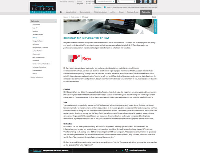 Klantcase over FP-Ruys, een leverancier van postverwerkende systemen waarvoor Trends een nieuw communicatiesysteem inclusief klantenservice installeerde.